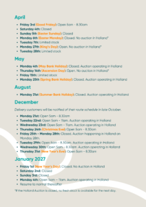 You can view our 2026 Holiday and Non-Auction calendar below for a full overview of key dates throughout the year.